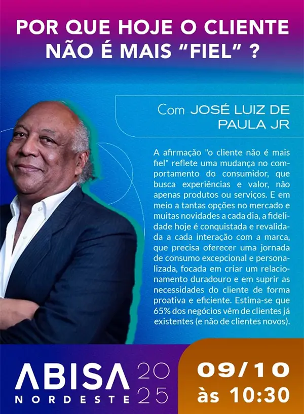Palestra: Por que hoje o cliente não é mais “fiel”? A afirmação “o cliente não é mais fiel” reflete uma mudança no comportamento do consumidor, que busca experiências e valor, não apenas produtos ou serviços. Em meio a tantas opções no mercado e muitas novidades a cada dia, a fidelidade hoje é conquistada e revalidada a cada interação com a marca, que precisa oferecer uma jornada de consumo excepcional e personalizada, focada em criar um relacionamento duradouro e em suprir as necessidades do cliente de forma proativa e eficiente. Estima-se que 65% dos negócios vêm de clientes já existentes (e não de clientes novos). Com José Luiz de Paula Jr.
