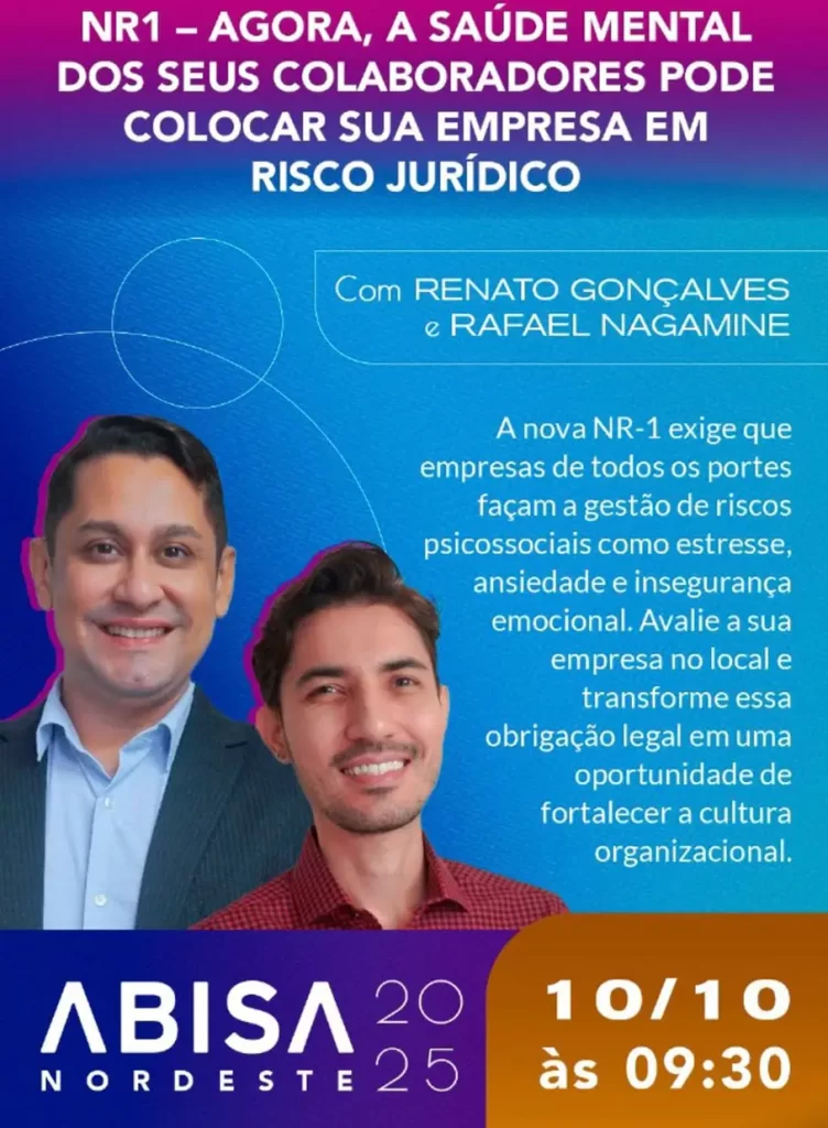Palestra: NR-1 – Agora, a saúde mental dos seus colaboradores pode colocar sua empresa em risco jurídico… A nova NR-1 exige que empresas de todos os portes façam a gestão de riscos psicossociais, como estresse, ansiedade e insegurança emocional. Avalie a sua empresa no local e transforme essa obrigação legal em uma oportunidade de fortalecer a cultura organizacional. Com Renato Gonçalves/Rafael Nagamine – H2R Consultoria.