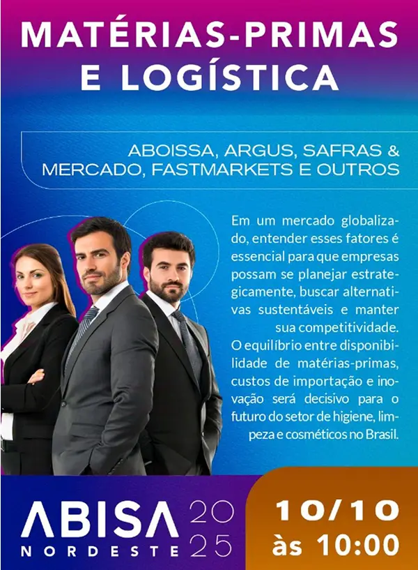 Palestra: Matérias-primas e logística (sebo, láuricos, plásticos etc.). Em um mercado globalizado, entender esses fatores é essencial para que empresas possam se planejar estrategicamente, buscar alternativas sustentáveis e manter sua competitividade. O equilíbrio entre disponibilidade de matérias-primas, custos de importação e inovação será decisivo para o futuro do setor de higiene, limpeza e cosméticos no Brasil. Com Aboissa, Argus, Safras & Mercado, Fastmarkets e outros.