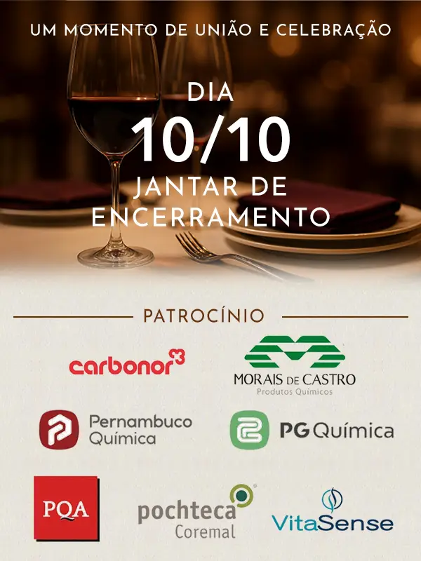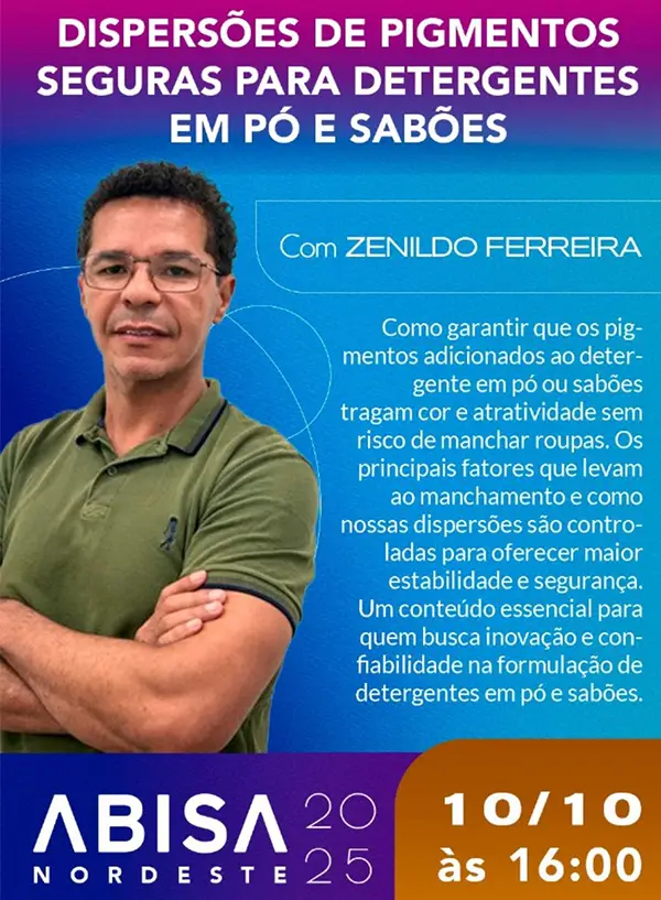 Palestra: Dispersões de pigmentos seguras para detergentes em pó e sabões. Como garantir que os pigmentos adicionados ao detergente em pó ou sabões tragam cor e atratividade sem risco de manchar roupas. Serão apresentados os principais fatores que levam ao manchamento e como nossas dispersões são controladas para oferecer maior estabilidade e segurança. Um conteúdo essencial para quem busca inovação e confiabilidade na formulação de detergentes em pó e sabões. Com Zenildo Ferreira.