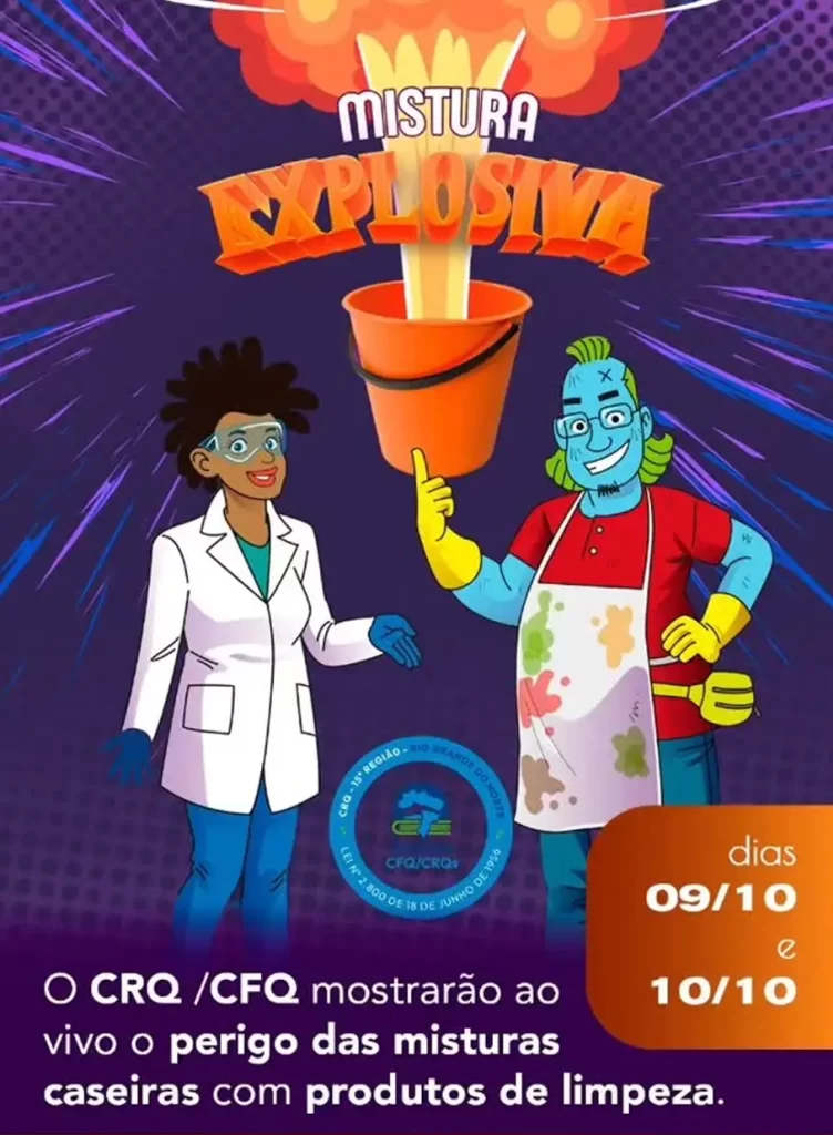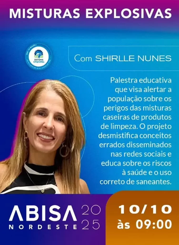 Palestra: Misturas explosivas em produtos de limpeza: cuidados e perigos. No dia a dia, muitas pessoas acreditam que misturar produtos de limpeza aumenta sua eficácia. No entanto, essa prática pode ser extremamente perigosa e até gerar reações explosivas ou tóxicas. Nesta palestra, você entenderá as reações de algumas misturas. Durante o evento, essas reações serão mostradas ao vivo e você poderá participar também! Os produtos de limpeza são seguros quando usados corretamente. O segredo está no uso consciente e responsável, evitando riscos desnecessários. Com Shirlle Nunes – CRQ (Conselho Regional de Química) – Rio Grande do Norte.